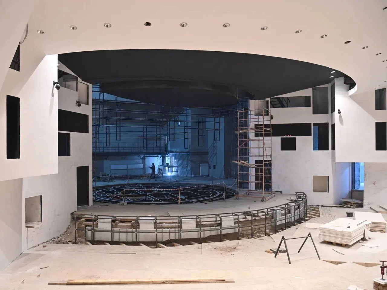Подрядчиком выступает компания «АРТ Ремстрой», которая значительно увеличила темпы строительства. Уже завершены черновые отделочные работы в помещении сцены и монтаж конструкций барьеров. Подготовлены стены зрительного зала под нанесение декоративной штукатурки.